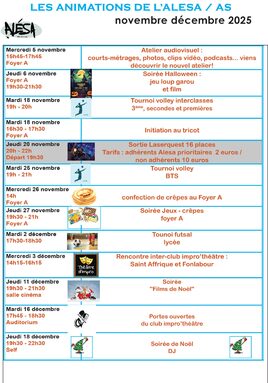 Par ISABELLE VILLEBRUN, publié le mardi 4 novembre 2025 16:01 - Mis à jour le mardi 4 novembre 2025 16:01Programme des animations proposées par l'ALESA et l'AS -